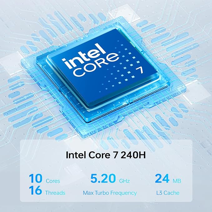 - AI-Powered Performance: Intel Core 7 240H Processor (10 Cores, 16 Threads, 24MB L3 Cache, Base Speed: 1.8 GHz, Turbo Speed: 5.20 GHz), with Intel Integrated Graphics