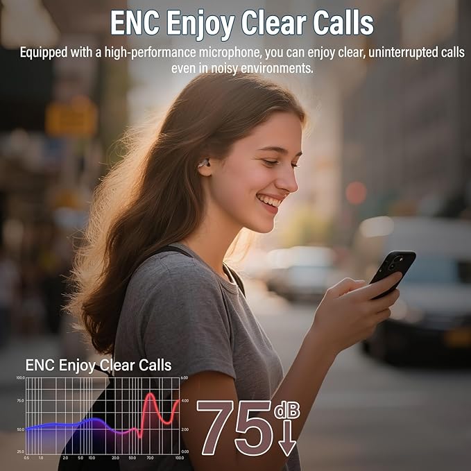 - Clear Calls with ENC Noise Reduction: Bluetooth Headphones Built-in ENC microphones intelligently filter background noise so your voice stays clear and natural during calls. Even in noisy streets, windy weather, or busy gyms, you can enjoy smooth, face-to-face call quality that makes every conversation effortless.