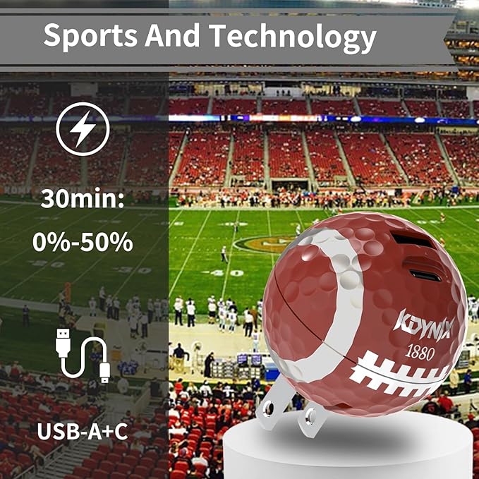 - 【Unique Golf Design & Dual-Port Fast Charging】Innovative Golf Ball Charger block with Realistic golf ball texture design, both fun and functional. The 20W USB-C Charger Block with a USB-A port (20W_Max) and a USB-C port (20W_Max), Dual ports maximum output 15W. It can charge two devices at full speed at the same time (dual ports intelligently distribute current). Made of high-quality ABS material, durable and lightweight. Prevents scratches and has foldable prongs.