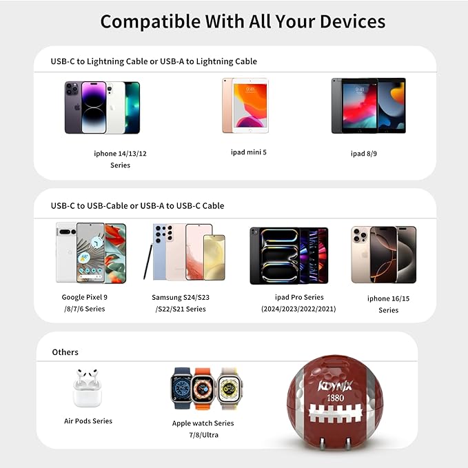 - 【Universal Compatibility & Warranty Support】This USB-C charging block is compatible with all smartphones and tablets, such as iPhone 14/13/12/11/X series, iPad, Samsung Galaxy, Google Pixel, AirPods, etc. (support PD3.0/QC3.0/Apple 2.4A/FCP/SCP/AFC). KDYNIX guarantees a 1-year warranty and 24/7 customer service support. If you have any concerns, please contact us through Amazon.