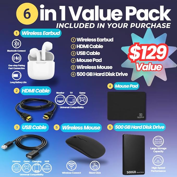 - [6-in-1 HubxcelAccessory with Lifetime Office 2024] HubxcelAccessory includes wireless earbuds, 500GB external drive, USB extension cord, HDMI cable, mouse pad, and wireless mouse. Free MS Lifetime Office 2024 included Al Powered Copilot. For Home, Student, Professionals, Small Business, School Education, and Commercial Enterprise.