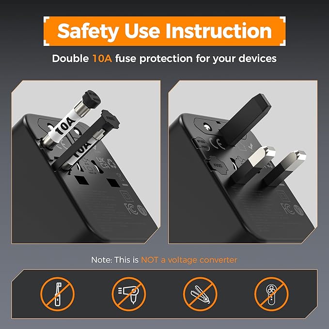 - Portable and Safety: The size and weight of this universal plug adapter is 2.44× 2.17× 2.09 in and 5.45 oz, saving the space in your suitcase; This international travel adapter has double 10A fuse, protects your devices during use
