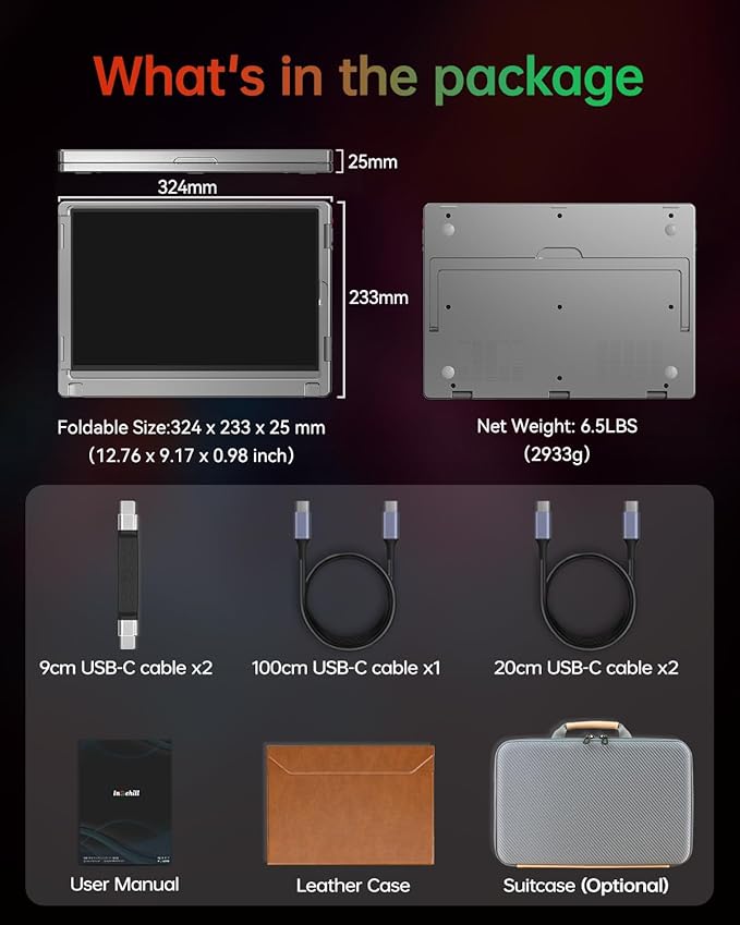 - USB-C PLUG-PLAY FOLDABLE MONITOR - Intehill LR13U travel monitor includes two full-function USB-C ports and one charging USB-C port. Connect your laptop's original charger to the dual screen monitor's rear USB-C port to power both devices simultaneously. Designed to pair seamlessly with 13-14 inch laptops, especially for MacBook Pro and for MacBook Air models, for a true dual-screen setup