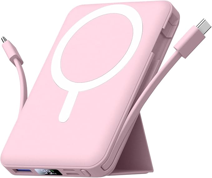 - 【Built-in TWO Cables & Foldable Stand】The portable travel charger for iphone has built-in USB C charging cables, perfectly compatible with iPhone or Type-C devices, no need to carry extra cables; The Magnetic Wireless Portable Charger Features a versatile built-in foldable kickstand can replace mobile phone stand that keeps your iPhone15/14/13/12 upright for a comfortable viewing angle.