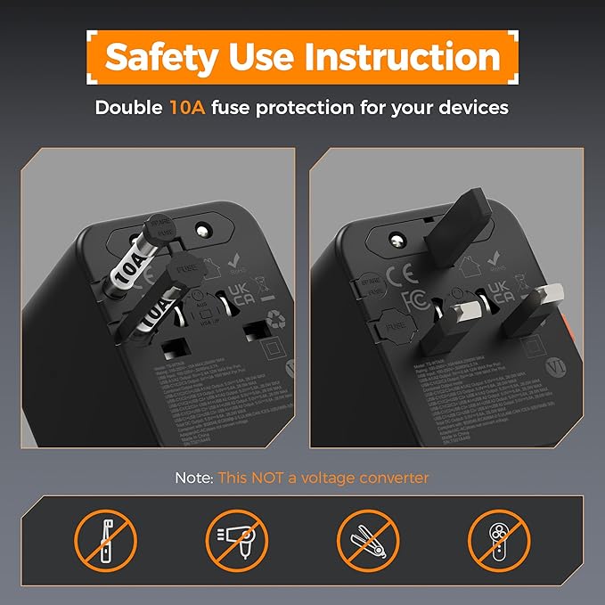 - Portable and Safety: The size and weight of this international travel adapter are 3.03×2.13×1.97 in and 5.67 oz, saving the space in your suitcase; This travel outlet adapter has double 10A fuse, protects your devices during use