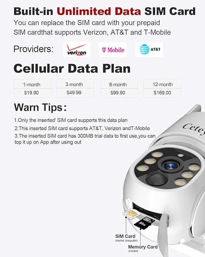 - 4G Cellular Security Cameras, No WiFi Support: This outdoor wireless surveillance camera (SIM card included) can be used in any area with 4G signal without WiFi distance limitation.Protect your livestock and assets with the Cetey 4G LTE Solar Camera, designed for rural and off-grid locations. Compatible with Verizon, T-Mobile, and AT&T networks, it delivers reliable connectivity without WiFi. (4G Subscription fee Required)