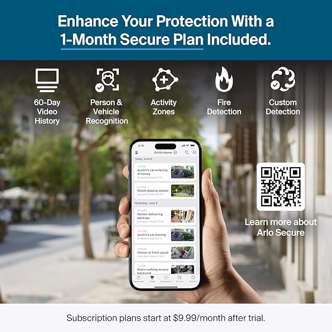- Enhanced Protection with 1-Month Secure Plan Included: Access 60-Day Video History, Custom Detection, Event Captions, 24/7 Emergency Response, Activity Zones & more. After trial, subscription plans start at $17.99/month (billed annually).