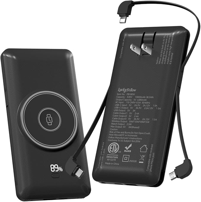 - 6 Devices Charging Simultaneously: This portable charger battery pack features 5 outputs, including 3 cable outputs and USB-C & USB-A outputs. At the same time, you can use wireless charging on the front of the power bank to charge your mobile phone or watch, Charge up to 6 devices simultaneously. For Mag-Safe power bank supports 5W, 7.5W, 10W and 15W wireless charging; USB-C ports support Power Delivery up to 20W, allowing for fast charging of USB-C enabled devices; USB-A ports deliver up to 22.5W, supporting Quick Charge 3.0 for rapid charging of legacy devices.
