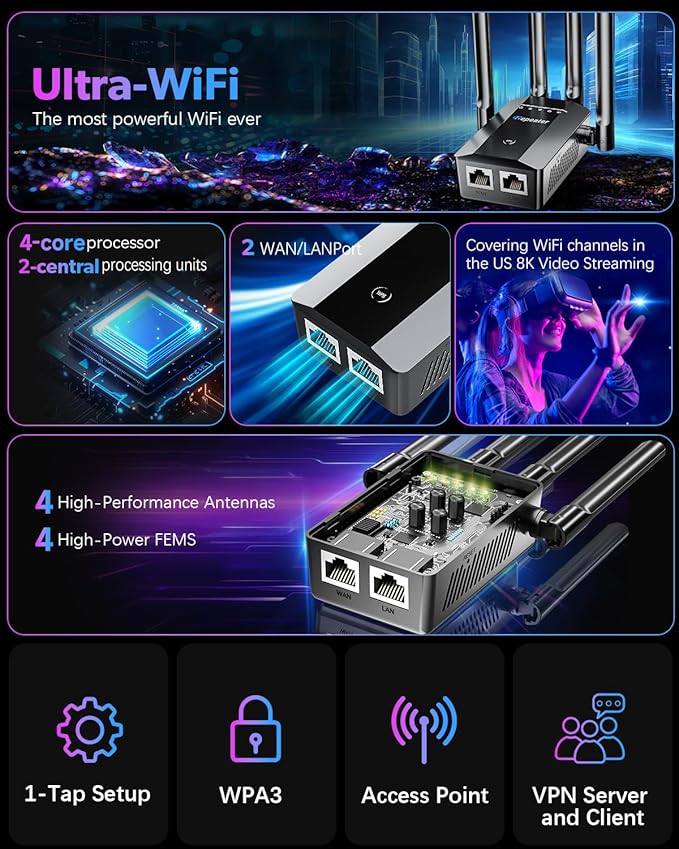 - BANK-LEVEL ENCRYPTION MEETS MILITARY-GRADE WIFI SECURITY! With WPA/WPA2 encryption, it protects against unauthorized access and data theft, ensuring secure connections for home, office, and outdoor use. Its powerful CPU and intelligent biochips ultra-core processor deliver fast and stable internet, ideal for online work, HD streaming, gaming, browsing, and calls without delays or buffering. Upgraded security features detect and prevent risks in real time, compatible with all router brands, making it perfect for home, business, and travel. Additionally, its military-grade encryption create an impenetrable defense against hackers, suitable for various intdoor conditions.