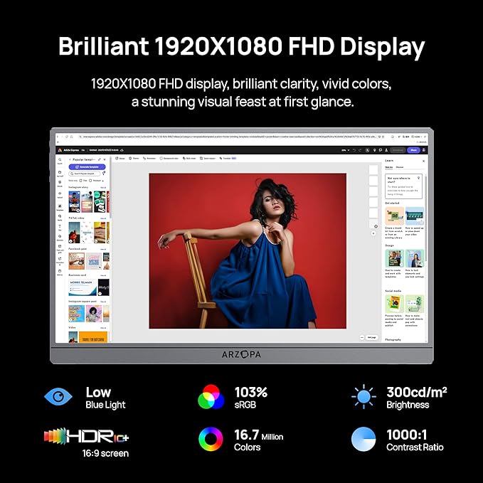 - [Superior 17.3 inch Large Display] ARZOPA Z1C PLUS portable laptop monitor, larger screen offers a more perfect 16:9 proportion which providing extra visual space for multitasking, gaming, or content viewing. The increased size eliminates the cramped feel of smaller monitors, making every interaction comfortable and immersive