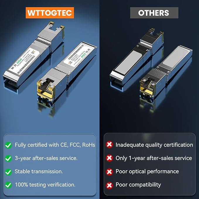 - Guaranteed Compatibility: Each module is rigorously tested for compatibility with1/2.5/5/10Gb switches, routers, servers, and NlCs, including Ubiquiti Dream Machine Pro/SE,TP-Link TL-SX3206HPP, Mikrotik routers, and Intel X520-DA2/X550-AT2.