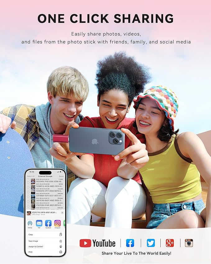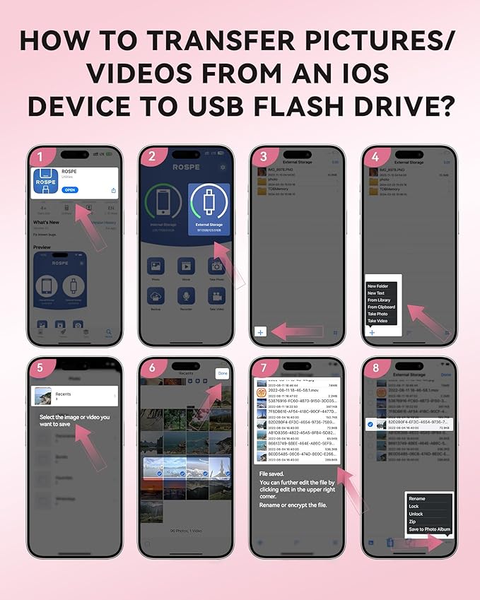 - Compact & Convenient: This MFi-Certified 256GB iphone photo storage stick helps you solve storage issues on your iPhone/iPad/PC, allowing you to easily back up your photos, videos, and phonebook with just one click using the app USB drive. (Note: To use this iphone memory stick on an iPhone/iPad, please download and install the "ROSPE" app from the App Store. For Android phones, simply enable the OTG function, no need to download any additional apps.)