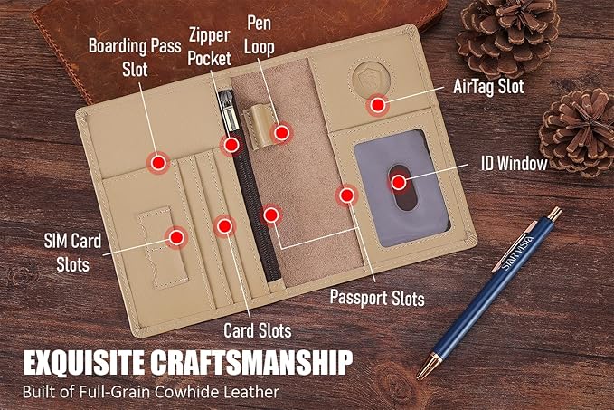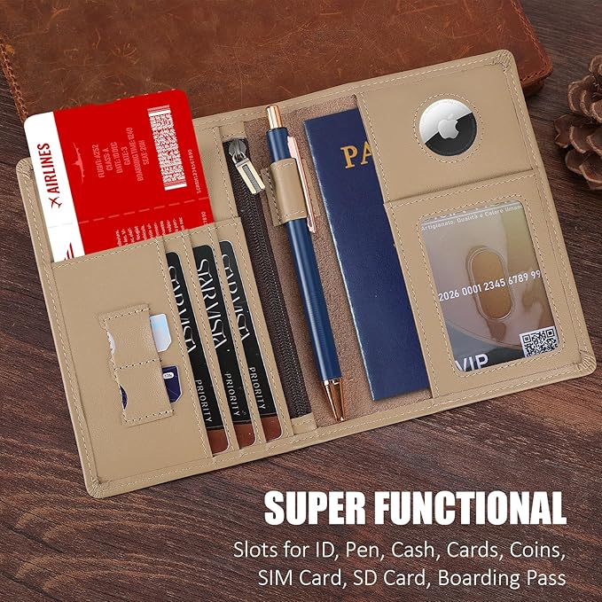 - COMPREHENSIVE STORAGE: Features passport slot, receipt compartment, zipper coin/cash pocket, boarding pass sleeve, ID window, 3 card slots, and dedicated AirTag pocket
