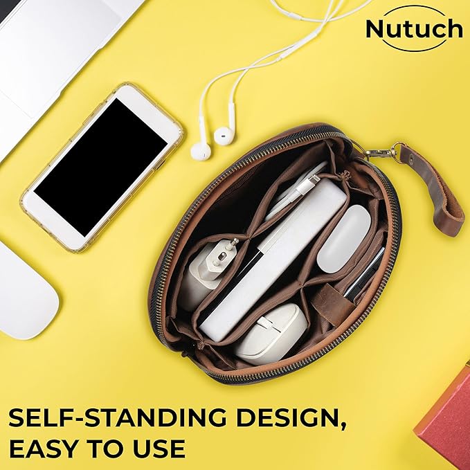- The Nutuch Leather Tech Pouch is crafted from premium full-grain leather, offering exceptional durability, a soft feel, and a unique texture that ensures long-lasting elegance. Its two-tone design adds a touch of sophistication to this stylish tech organizer.