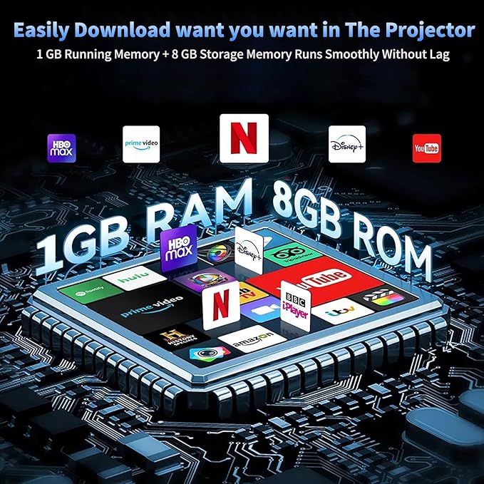 - 【 Smart Projector Equipped with Android TV 13 System 】 The movie projector is equipped with 1GB of RAM and 8GB of storage memory, covering popular streaming platforms such as Netflix, YouTube, etc. Whether downloaded into the phone projector or played online, just portable projector can turn anywhere into a fully functional entertainment center!