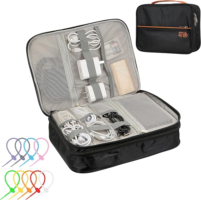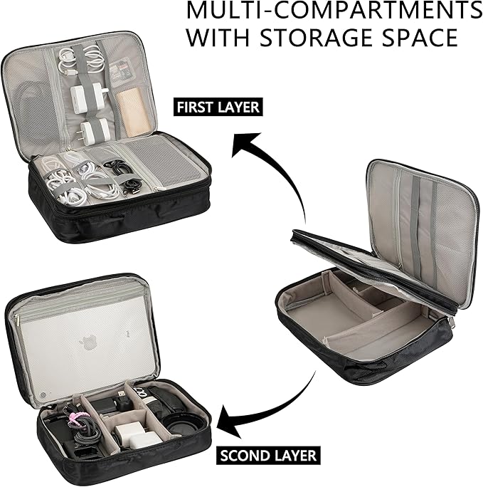 - 1️⃣ LARGE CAPACITY & DOUBLE LAYER DESIGN This electronics organizer features dual-layer compartments that offer ample storage for cables, USB drives, chargers, power banks, adapters, and more. The upper mesh pockets keep cords tangle-free, while the bottom padded dividers fit larger items like tablets or hard drives — keeping everything neat and accessible.