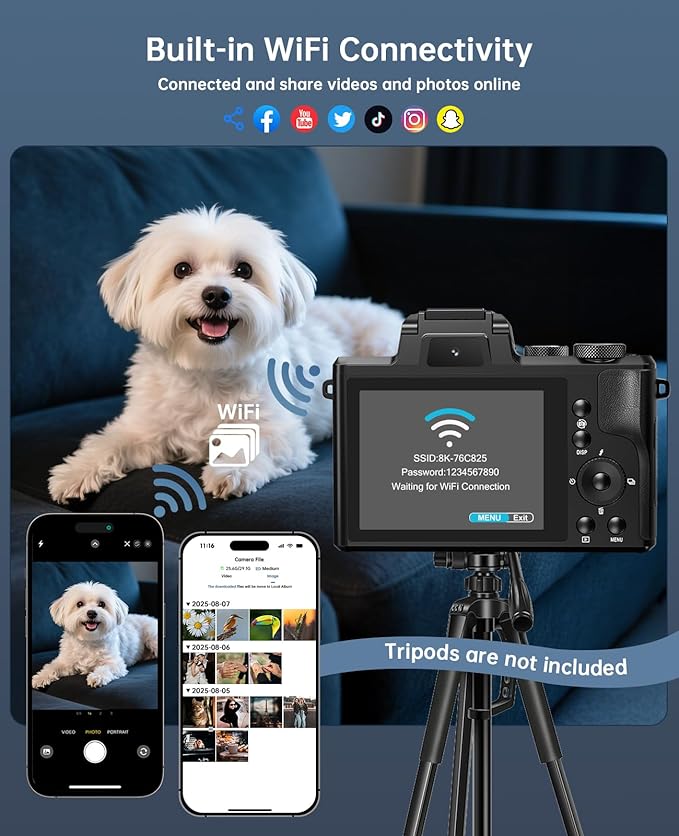- 【WIFI TRANSFER & 6-AXIS STABILIZATION】-This vlog camera bulit in wireless WiFi function, allowing you to instantly upload and share videos and photos directly to social media platforms, just need download the "iSmart DV2" app to your Android or iOS device. Our 8k digital camera is also great for video calls & live streaming, YouTube or social media use, has 6-axis stabilization that ensuring smoother videos, whether you're a beginner or just need a camera for daily use, it makes picture capturing and vlogging a breeze.