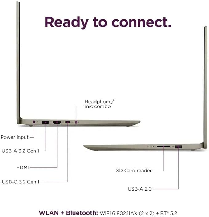 - Ease of Connectivity: Stay connected with various devices through the various ports the IdeaPad offers, such as 1x USB 2.0, 1x USB 3.2 Gen 1, 1x USB-C 3.2 Gen 1, 1x HDMI 1.4b, 1x Headphone / microphone combo jack (3.5mm), 1x Card reader, 1x Power connector.