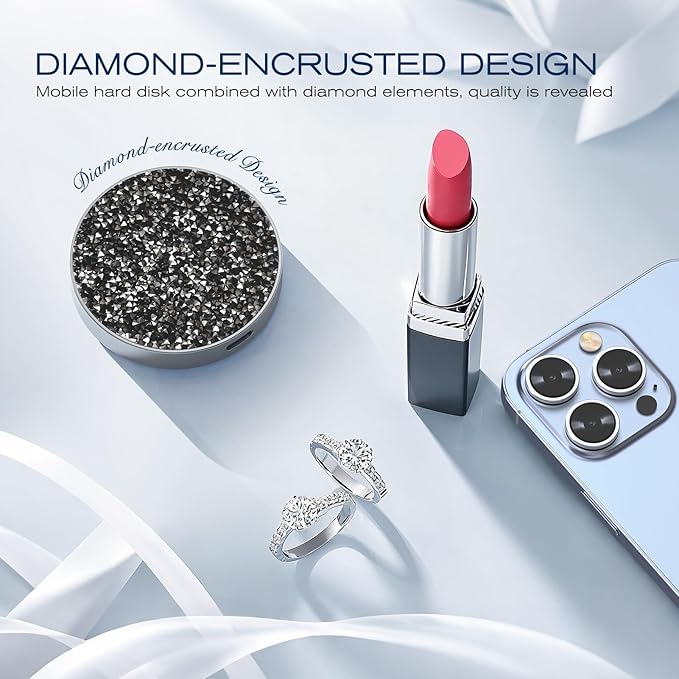 - Shining Elegance, Lasting Durability: The DIGIERA Diamond-Edition SSD combines a luxurious diamond-inspired exterior with a rugged aluminum casing, resisting shocks (1,500 G), vibrations (10–2,000 Hz), and drops up to 3.94 ft. Weighing only 1.58 oz and measuring 2.28 x 0.46 in, this ultra-portable SSD fits easily into your pocket or purse—perfect for professionals who want both style and reliability on the go