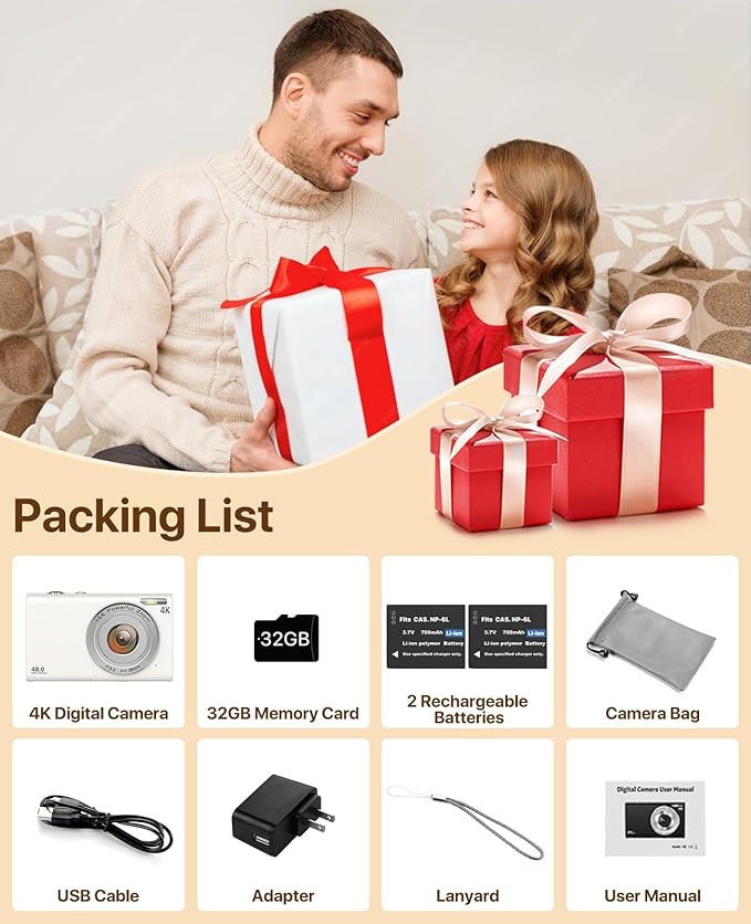 - 2025 NEWEST ULTRA HD 4K & 48MP DIGITAL CAMERA - Capture every detail with ease! This 4K digital camera is equipped with an advanced CMOS image sensor, delivering stunning 48MP true-to-life photos and crisp 4K Ultra HD videos. This vlogging camera for YouTube designed for adults, teens, and kids alike — perfect for capturing nature, family gatherings, or everyday fun with stunning clarity.