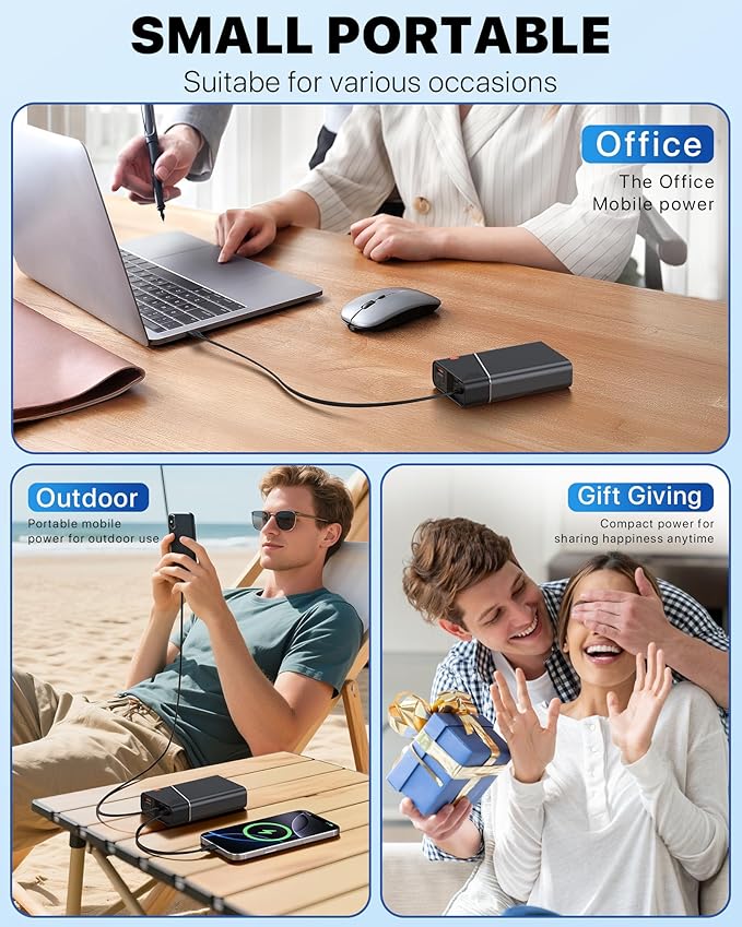 - Built-in Cable – This 20,000mAh portable charger features a built-in Type-C cable, compatible with most cellphones and laptops. This compact power bank is widely compatible with the iPhone series (iPhone, iPad, AirPods), Android devices (Samsung, Google Pixel, Realme, Oppo, Vivo, LG, Motorola), and other electronics like small fans, heating vests, and smart wearables