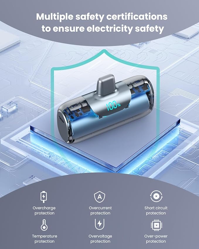 - 🛡【Advanced Pass-Through Technology & Quad-Protection Safety】This mini power bank supports pass-through charging, you can charge your iPhone while charging the power bank. Advanced Intelligent Temperature System safeguards your iPhone’s battery health. Features quad-layer protection against over-charge, over-voltage, over-current, and short circuits – charging safely made simple.