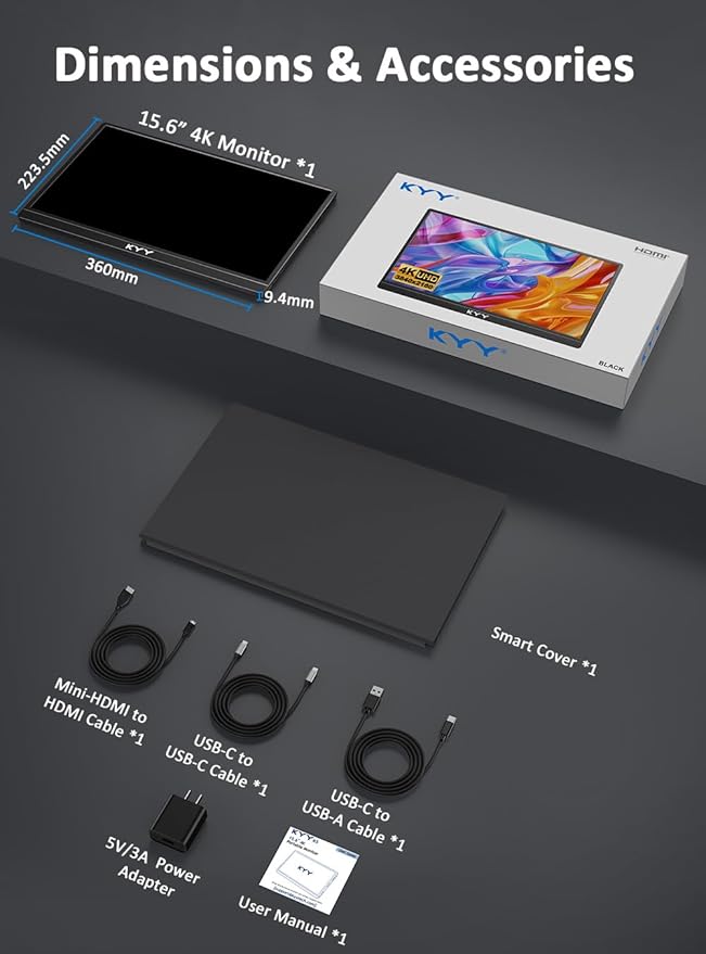 - [ True 4K UHD Portable Monitor ]: KYY 15.6" portable monitor features an S-grade IPS panel, boasting 4K UHD resolution (3840 x 2160), Combining 4K micro-precision with 60 Hz smooth motion, KYY 4K portable monitor delivers an entirely new sensory experience of pixels and detail, satisfying gamers' desire for a seamless gaming experience. It provides stunning 4K visuals, creating perfect visual harmony.