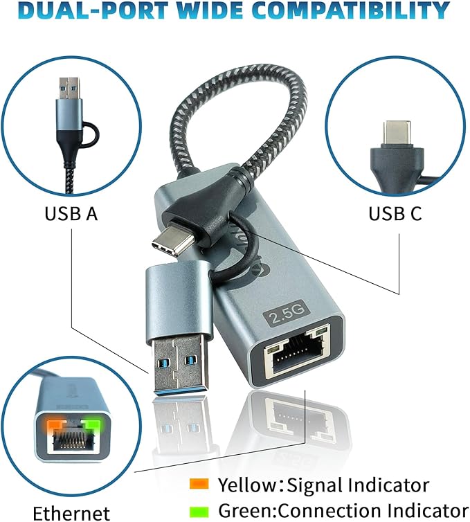 - [Plug to Play] USB Ethernet Adapter Enjoy high-speed networking up to 2.5Gbps without installing drivers. LED lights providing intuitive status indicators.