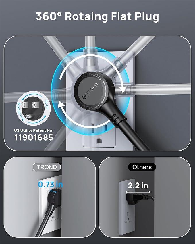 - 360° Rotating Flat Plug: 360° rotating flat plug design can fit any plug and be inserted perfectly at any angle(0.73 in thickness). Handy to use in confined areas. US Utility Patent No. 11901685. Made of 14AWG pure copper, the 10-foot extension cord is heavy-duty and has better current carrying capacity (15a).