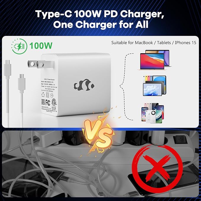 - 【Type-C 100W PD Fast Charger】Travel with confidence using our compact 100W USB-C PD fast charger with a 6.56ft cable. A 15-minute charge provides up to 2 hours of standby time. Compatible with multiple devices, this charger simplifies your travel setup.