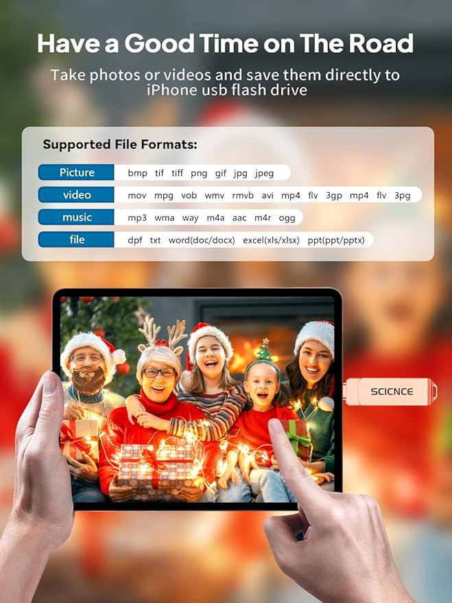- 【Watch Movies, Photos and Play Music Directly From Phone Flash Drive】Store your favorite videos, audios and music on your iPhone's Photo Stick, then seamlessly plug and play on your iPhone or iPad anytime, anywhere. No more need for Internet or WiFi. This iPhone storage device plays videos in many different formats. Pictures stored on the Phone storage device also support different formats. Great way to store all your pictures and videos on an phone external storage device.