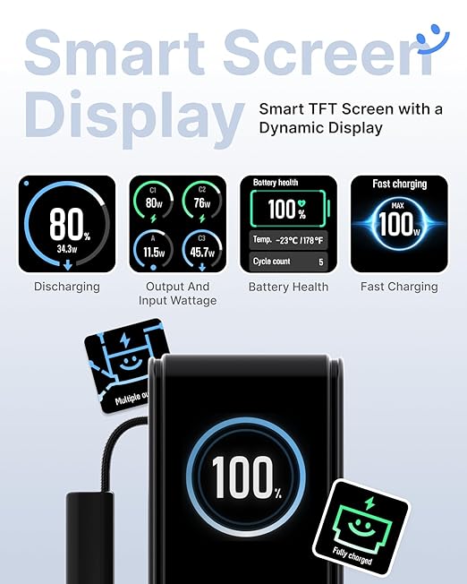 - Smart TFT Screen with a Dynamic Display: View your real-time capacity, port power, battery health, temperature, charging cycles, emojis, and more. The crystal-clear TFT display screen lets you check your data at any angle or lighting condition.