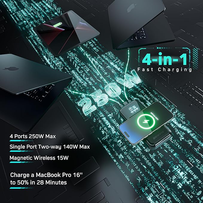 - 4-in-1 250 Total Output: Featuring two USB-C ports, one USB-A port, and one magnetic wireless charging pad, the power bank delivers up to 250W powered by PD 3.1 technology. Boost your MacBook Air (M2) to 50% in just 28 minutes. With top heat dissipation technology, it maintains a constant 140W single-port output without overheating.