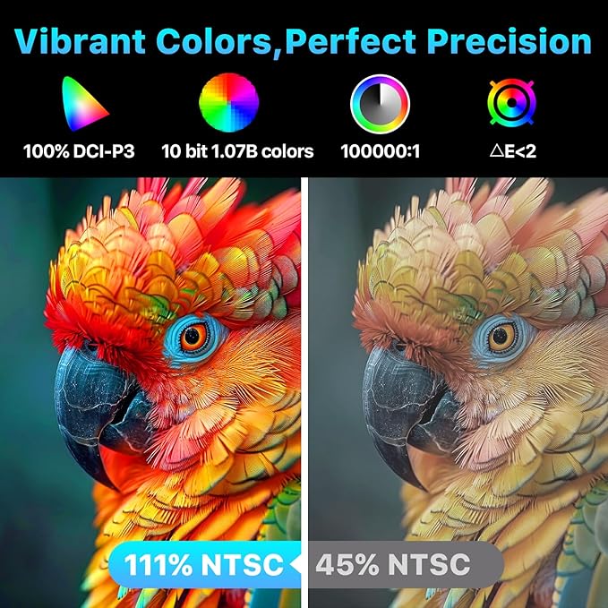 - Pixel-Perfect Color Precision: Experience flawlessly accurate colors with this 14" 4K OLED portable monitor: factory-calibrated to ΔE < 2, 100% DCI-P3 (also 111% NTSC) professional gamuts, and 10-bit color depth rendering 1.07 billion true-to-life hues. Every shade, tone, and gradient stays faithful to the original source—no distortion, no inaccuracy. Paired with 350 nits brightness and 100,000:1 contrast ratio (deep blacks + vivid highlights), it delivers layered, lifelike visuals that meet studio standards. Perfect for photo/video editing, graphic design, or any creative work demanding uncompromising color accuracy