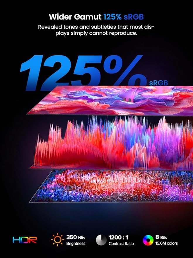 - 【125%sRGB for Vivid Visuals】Exceptional color accuracy and clarity. Portable laptop monitor features a 125% sRGB wide color gamut and Full HD resolution, bringing every hue to life with vivid realism. Combined with HDR technology and 350nits brightness, it delivers detailed, true-to-life imagery—perfect for immersive entertainment, creative work, or business work.