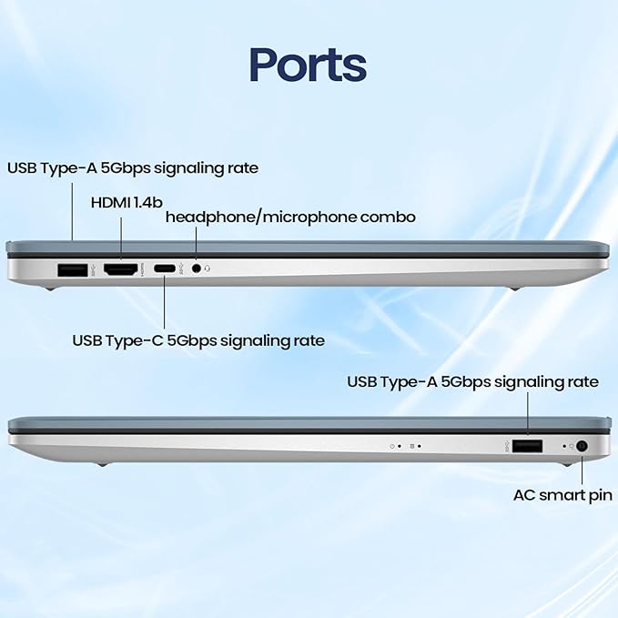 - [Enhanced Connectivity and Versatility] 1 x USB Type-C 5Gbps signaling rate, 1 x headphone/microphone combo, 2 x USB Type-A 5Gbps signaling rate, 1 x AC smart pin, 1 x HDMI 1.4b, Webcam, Fingerprint Reader, Backlit Keyboard, Wi-Fi 6, Windows 11 Home