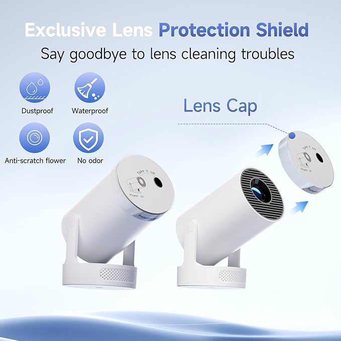 - Ultra-Portable Versatility with Added Protection: Weighing a mere 1.45lb, this portable projector adapts effortlessly to diverse setups: ceiling mounts, tabletops, tripods, or 180° angled projections. Its lightweight design ensures quick deployment in any environment, from impromptu outdoor screenings to cozy indoor entertainment. The newly added manual lens cover provides scratch-resistant protection, keeping your lens safe during transport and storage without compromising its instant-setup convenience.