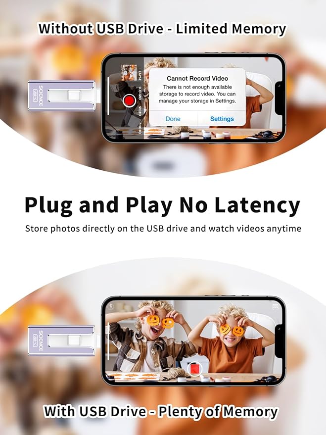 - 【Watch Movies, Photos and Play Music Directly From Phone Flash Drive】Store your favorite videos, audios and music on your iPhone's Photo Stick, then seamlessly plug and play on your iPhone or iPad anytime, anywhere. No more need for Internet or WiFi. This iPhone storage device plays videos in many different formats. Pictures stored on the Phone storage device also support different formats. Great way to store all your pictures and videos on an phone external storage device.