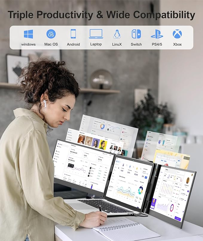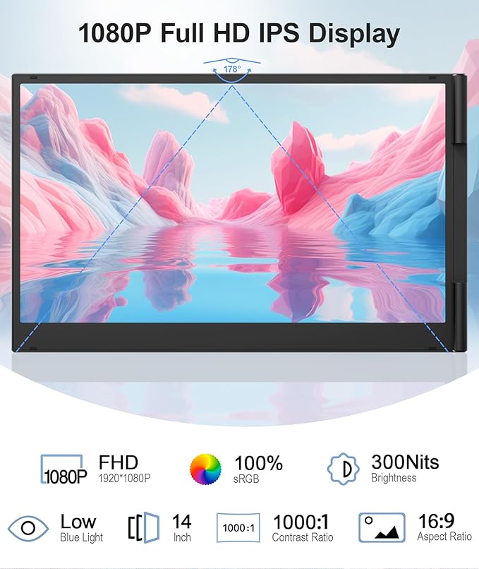 - 【FHD 1080P & Ultra-Slim Display】This 14" Triple screen for laptop portable with 178° wide viewing angle, 1920×1080 resolution, 300 nits brightness, and 72% NTSC color for lifelike clarity. Features anti-glare, eye-care tech, and built-in speakers—ideal for creatives, gamers, and professionals on the go.