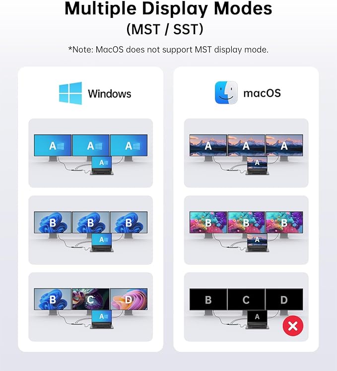 - 【Dual/Triple Display Docking Station】 Dual HDMI and VGA allow versatile display combinations. Use HDMI1 alone up to 4K@60Hz, HDMI2 up to 4K@30Hz, VGA up to 1080P@60Hz. Windows supports dual or triple displays (extended/mirrored). NOTE:macOS supports mirror + one extended display.