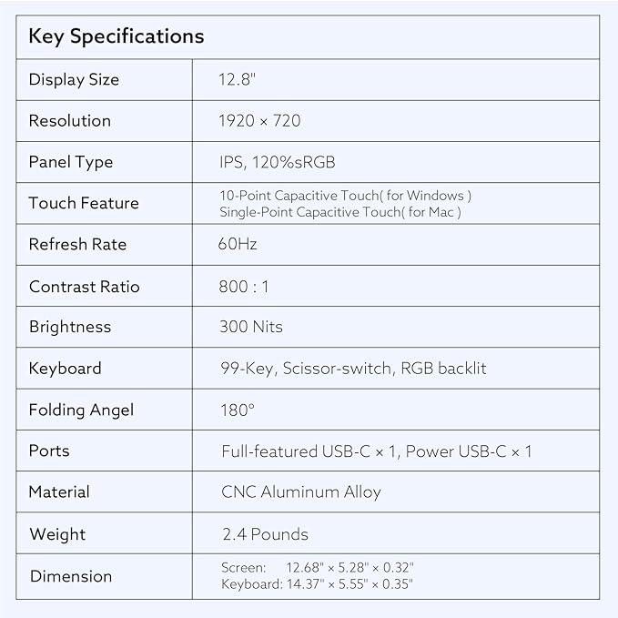 - 【180° Flexibility & Ultra-Portable Design】 This 12.8" portable monitor is engineered for adaptability. The 180° hinge allows you to lay it flat or find the perfect viewing angle. Its all-in-one design with a integrated keyboard and high-quality CNC aluminum construction makes it the ultimate durable and portable workstation.