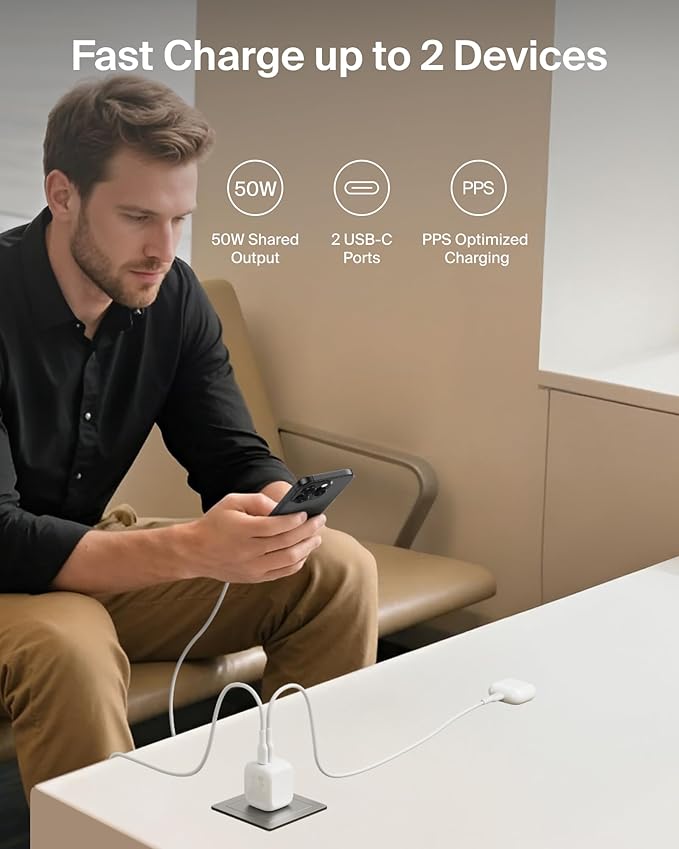 - FAST CHARGING TECHNOLOGY: This 2-port wall charger uses USB-C PD3.1 tech to rapidly charge iPhone 16 and Samsung Galaxy S25 from 0-50% in just 24 minutes.* Chromebook, MacBook Air 13, iPad Air 13, Pixel 10, and much more also receive a fast, safe charge.
