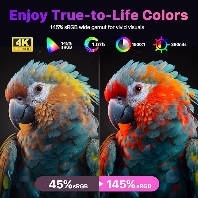 - Sharp 4K Visuals with High Color Accuracy: Experience stunning detail with a 4K UHD portable monitor featuring 145% sRGB, 1.07B colors, and a 1500:1 contrast ratio. Designed for creators, gamers, and professionals who demand precision and vibrant, lifelike color performance.
