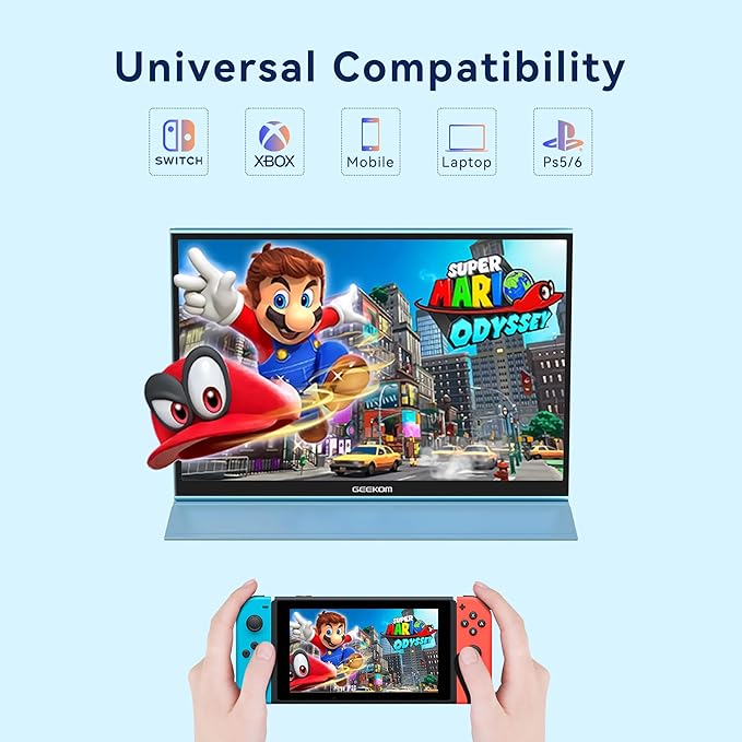 - [Second Monitor] The GEEKOM portable monitor serves excellently as a secondary display, allowing you to share it in meetings using duplicate or extended modes, or even extend it to your Switch screen for gaming sessions. This makes it an ideal tool for enhancing productivity during activities such as photo editing, web browsing, reading books, and data analysis.