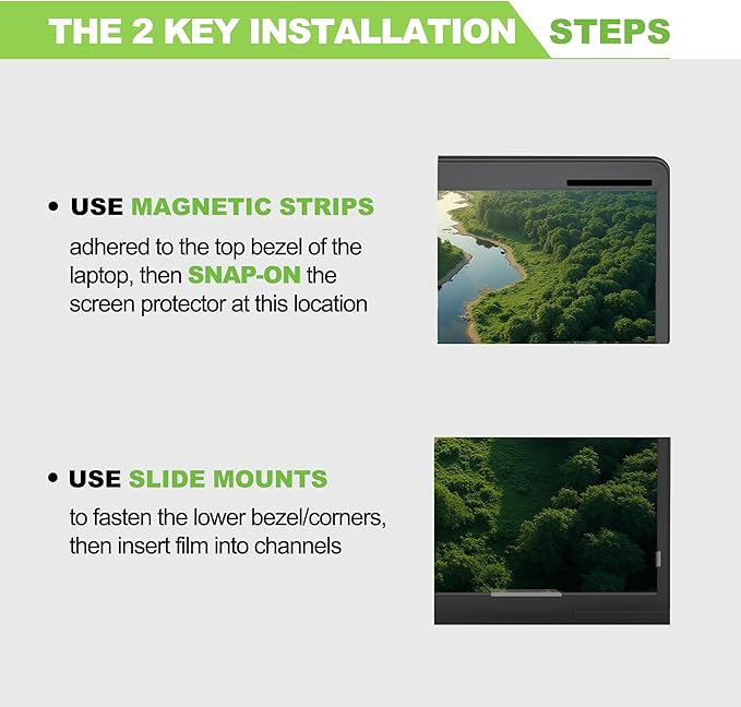 - 【Ideal for Everyday Use and Open Workspaces】: Uses the recommended two-step installation method to ensure a stable, anti-shake fit, with no adhesives and no sticky residue on your laptop screen. The filter stays securely in place even when closing the lid, and installs in just seconds — offering lasting, worry-free privacy protection