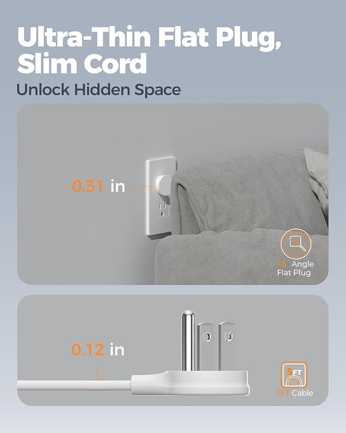 - Right Angle Flat Plug: With an ultra thin 0.31in flat head, this phone charger oulets can easily fit into tight spaces and hide discreetly behind sofa, bed; The 45 degree right angle design creates additional space for other plugs below without blocking