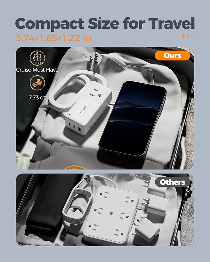 - Compact and Portable: Compact size 3.74×1.65×1.22 inches and light weight 7.73 ounces; TESSAN USB C charger block multiple ports fits easily into your luggage; No surge protection, meet your various charging needs on cruise ship and travel