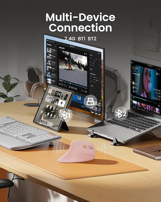 - Connect up to 3 Devices: This ergonomic wireless mouse features dual BT 5.0 and 2.4G USB connectivity modes for simultaneous connection of up to 3 different devices, and is compatible with Windows 8, Windows 10 or higher, Mac OS X 10.12 or higher, and Android 4.3 or higher