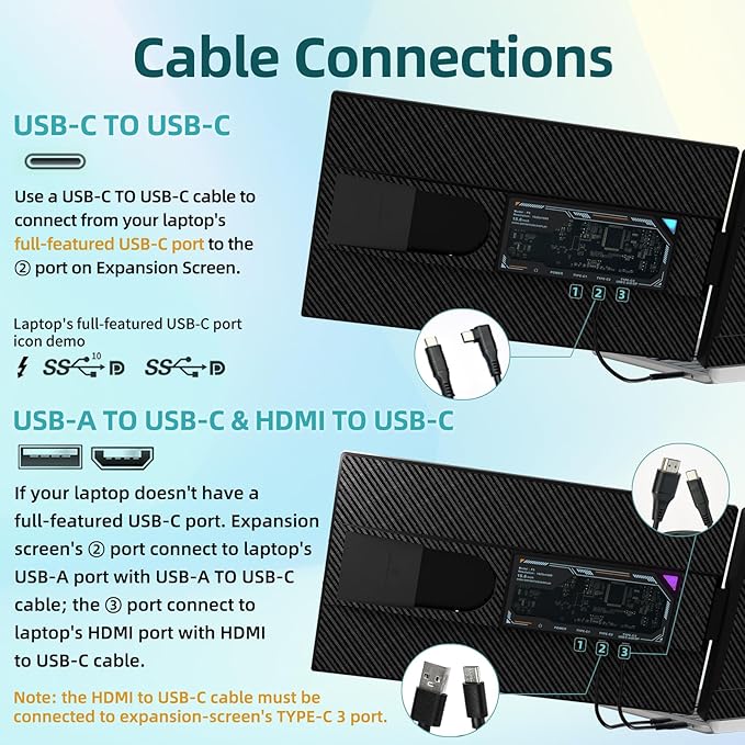 - Plug and Play: 1 full featured USB-C port or 1 HDMI port, your laptop is all set. The laptop monitor extender comes with all necessary cables (1* USB-C to USB-C Cable, 1* USB-A to USB-C Cable, 1* HDMI to USB-C Cable). Simply connect the portable monitor to your laptop via USB-C or HDMI and USB-A cable without the hassle of downloading additional drivers. Note: When using the HDMI cable, ensure to connect a USB-A to USB-C cable to the same screen extender for power supply.