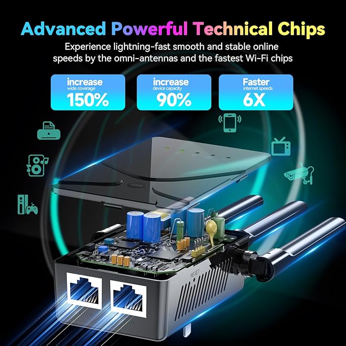 - ๐๐๐ง๐๐ง๐๐ง ๐๐๐๐ ๐๐ญ๐ฉ๐๐ฃ๐๐๐ง ๐๐๐ซ๐๐จ ๐๐ค๐ช ๐๐ฃ๐๐ญ๐ฅ๐๐๐ฉ๐๐ ๐๐ญ๐ฅ๐๐ง๐๐๐ฃ๐๐๏ผ4 High-Gain Antennas & Smart IC Chip For 360ยฐ Extension- Coverage Up to15555+Sq. Ft , No Signal Blind Spots | WPS One-Click Setup, No Tech Skills | WPA Military-Grade Security | Dual Gigabit Ethernet Ports, 0 Lag | 5 Modes Fits All Scenarios | Faster Stable Speed for 4K Streaming/Gaming | Indoor/Outdoor Use, Dead Zones Eliminated | Wall Penetration, Multi-Floor Coverage